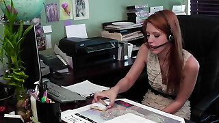 Crimson hair boss lesbian is disciplining a bad lesbo employee in a super hot interracial office sex action